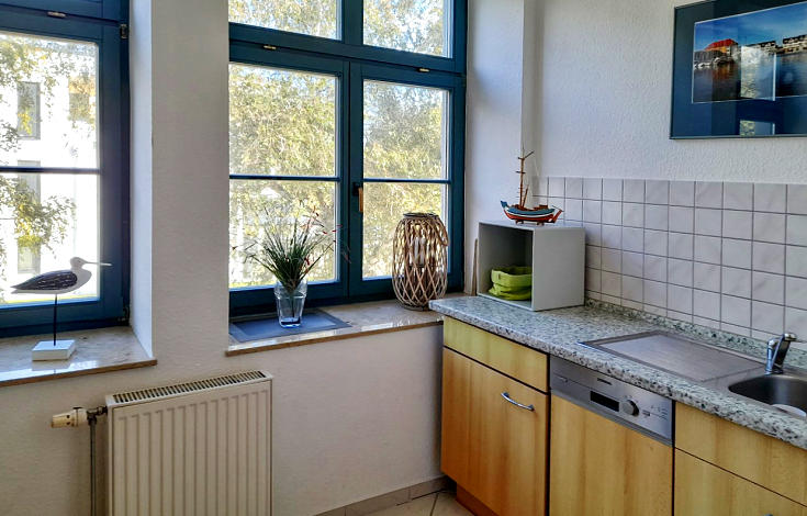 Küche mit Cerankochfeld, Backofen, Geschirrspüler, Spüle, Kühlschrank mit Gefrierfach, Wasserkocher, Toaster, Kaffeemaschine