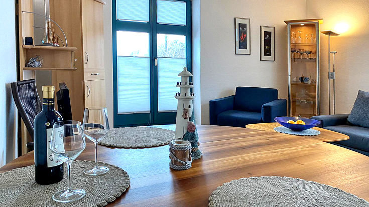 Die Fewo in Karlshagen besticht durch Ihre ruhige Lage, Geräumigkeit und Ausstattung. Manchmal hört man, wie der Schäfer von einem Deich zum anderen, seine Herde am Schlafzimmer vorbei treibt. Die Wohnung bietet Rückzugsmöglichkeiten, da der große Flur die beiden Haupträume trennt. Neuer Designfussboden, Plissees an großen Fenstern runden die Einrichtung ab.
